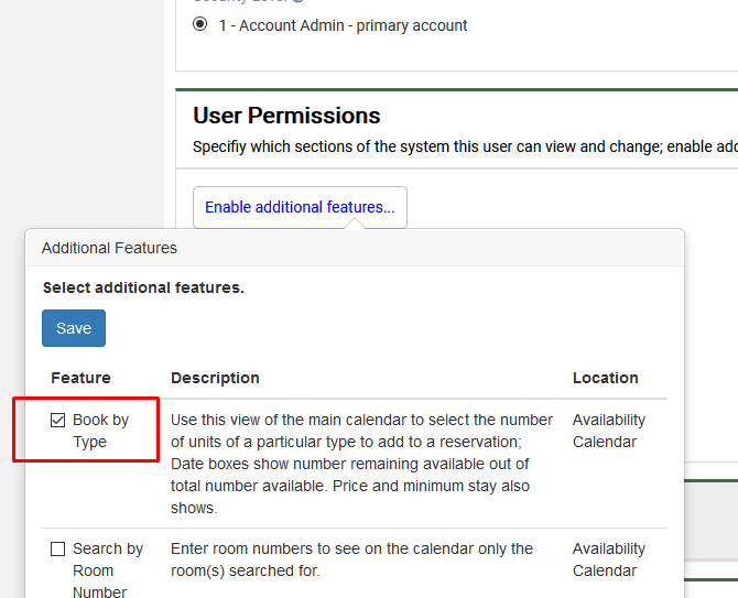 Use our hotel style reservation pages, combined with our book by type view of the availability calendar, for flexible and fast appointment bookings. To enable the book by type view, go to the Settings tab, Users, and expand the User Permissions section. Then click “Enable additional features…” and click “Book by Type.” Then over on …