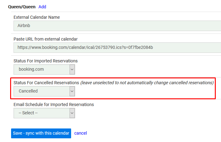There is unfortunately no perfect way to link incoming iCal reservations with reservations that were previously imported into ReservationKey. Which means finding reservations to cancel is not as clean of a procedure as matching an ID from the import file to an ID we saved in our database. Now, when new reservations are imported, the ID of the import link (an ID assigned to it by our system when it was saved to our database) is saved with the new reservation. Because matching reservations from the import file with reservations we previously imported is not as easy as matching ID numbers, instead, as we run through the import file we make a list of each reservation the file contains, based on the start/end dates. Then we compare that list to the list of reservations we previously imported for this particular import file (based on the import file ID). If a reservation exists in the system that is no longer in the import file, the system will then change that reservation status to your cancelled status.