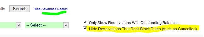 Also, a new feature in Reservations is the ability to hide reservations that have been set to a status which doesn’t block the calendar (such as Cancelled). Click Show Advanced Search to see this option.