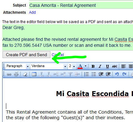 Additionally, PDF files can now be created from the contents of the email template, and attached to a message, all with just a few clicks. This is great for being able to dynamically generate PDF documents, where information is pulled into the PDF based on data saved in ReservationKey. An example of how this can be used is for creating rental agreements sent to guests renting vacation rental properties.