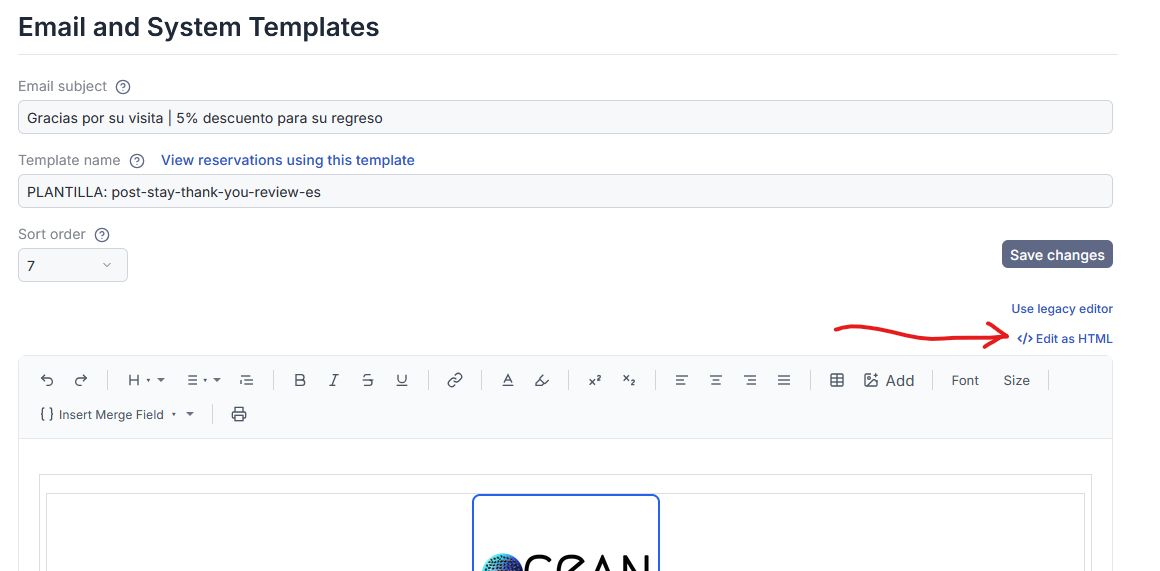 For users who build email templates outside of ReservationKey—using dedicated email template builders or custom HTML—the new “Edit as HTML” option is the key improvement.