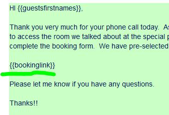– Build an email template using our new merge codes: {{bookinglink}} – link to multiple units or single units page {{bookinglink_calendar}} – link to calendar version page (if it exists as part of the reservation page specified to be used for the reservation). – This makes it easy to create an “inquiry” reservation and then send off an email template which contains the link to the booking page.