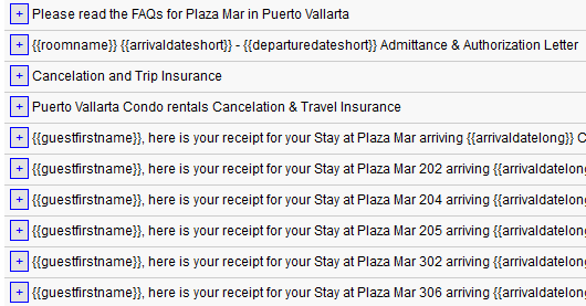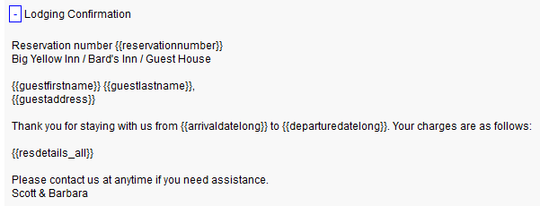 The email template section can also be used to make templates for emailing manually, or for printing. Users have created registration forms, invoices, and more. Also you might want to make lots of additional email templates which you can manually send as relevant to your guests. For example, a special email for honeymooners or an email for business travelers.