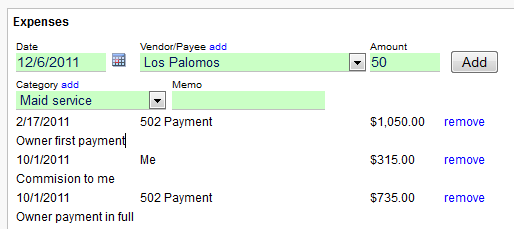 Use the expenses section in the Reservation Summary to keep track of expenses related to a reservation. This is a great place to track commissions owed for reservation referrals. You can even set up your own categories of expenses and save vendor names for quick use in the future. And this allows you to create Expense reports which show you how much you paid each vendor (such as how much you paid Judy in June), or how much you spent in each category (such as how much was paid in commissions in July).