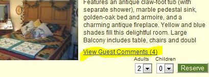 Guest comments can be automatically shown as a link next to each room (so new guests can see comments specific to the room they are interested in staying in) or you can just include one link to the guestbook next to your property information, or both.
