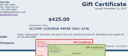 Selling gift certificates costs you nothing up front and increases your cash flow. And when you let ReservationKey manage your gift certificates there is almost no work on your end to sell them. Once a guest pays for a gift certificate (after selecting the amount they want to buy) an email is sent to them (or their recipient) with a printable certificate containing a unique code.