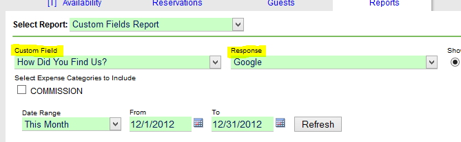 We’ve added a new report, this one called, Custom Fields Report. It is currently the third one from the bottom of the list of reports. It is a great way to create a list of reservations based on answers to custom fields. First, select the custom field, then select the answer (if a dropdown type) or enter your search criteria.