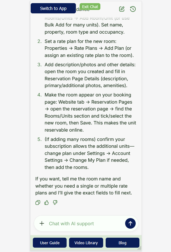 When we ask the AI “How do I add a new room?”, it walks through the exact same steps our human support team has outlined countless times before: