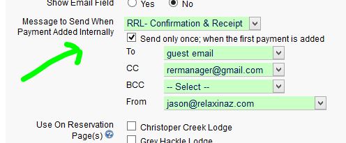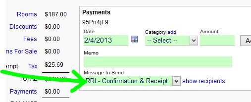 Now, when you go to the Payments section when editing a reservation, you will see the messages field pre-selected to the message you set. You also can edit the recipients, if necessary. If you have opted to only have the message sent automatically for the first payment, the next time you load the payment section, the message field will default to “No Message” but you can easily override that setting by selecting a message to send. Additionally, at any time should you not want to send a message, just set the selection to “No Message.”