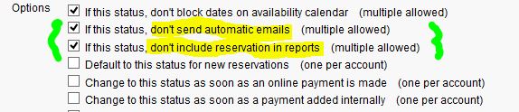 You can now set whether or not automatic emails should be sent based on the status. And, you can also set whether or not reservations should be excluded from reports based on the status.