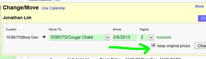 Now, when moving a reservation to a different Room/Unit, we have an option whether or not to keep the rates of the originally assigned Room/Unit. By default this box is NOT checked, but if you want to use the original rates check the box before clicking Change. If the box is not checked, then we will pull the rates for the new Room/Unit from the rate plan.