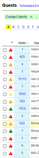Here, we can see all guests which have a contact alert set. The alert icon is the color of the alert.