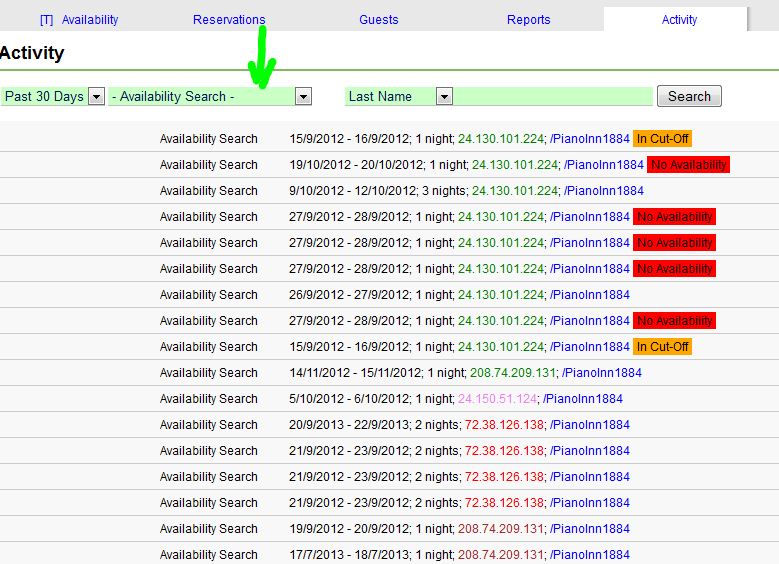When reviewing activity results for Availability Search (entries that get recorded when someone searches for availability on a Reservation Page), if the search results in no units available, a red “No Availability” tag appears next to the activity log. If the search was within your cut-off period, an orange “In Cut-Off” tag appears. Also, groups of searches performed by the same IP address are now color coded into blocks. These enhancements should make it much easier to spot trends in the activity results.