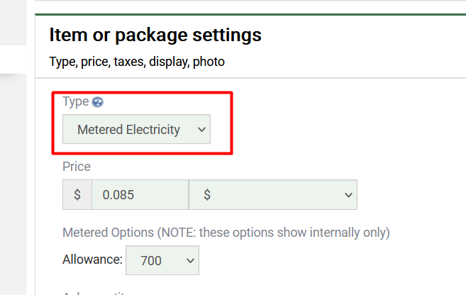 First, set up the item under Website tab, Items for Sale. Be sure to select “Metered Electricity” as the type, which then gives an option for setting a monthly allowance.