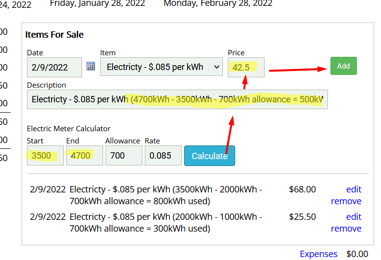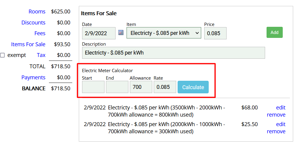 Now, over in a reservation, under Items for Sale, when the Metered Electricity item is selected a calculator appears.