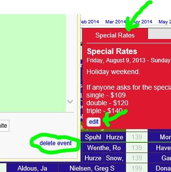 To delete an event, click the event title, click Edit, and then click Delete in the lower right corner of the edit window.