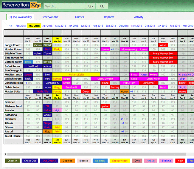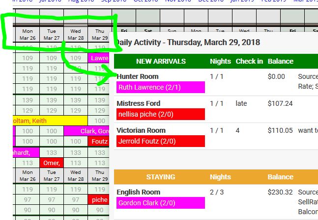 Now it is super easy to get an overview of your activity for the day. Simply click the date bar and a summary of arrivals, staying, and empty rooms will show. This also shows outstanding balance, number of guests, and number of nights.
