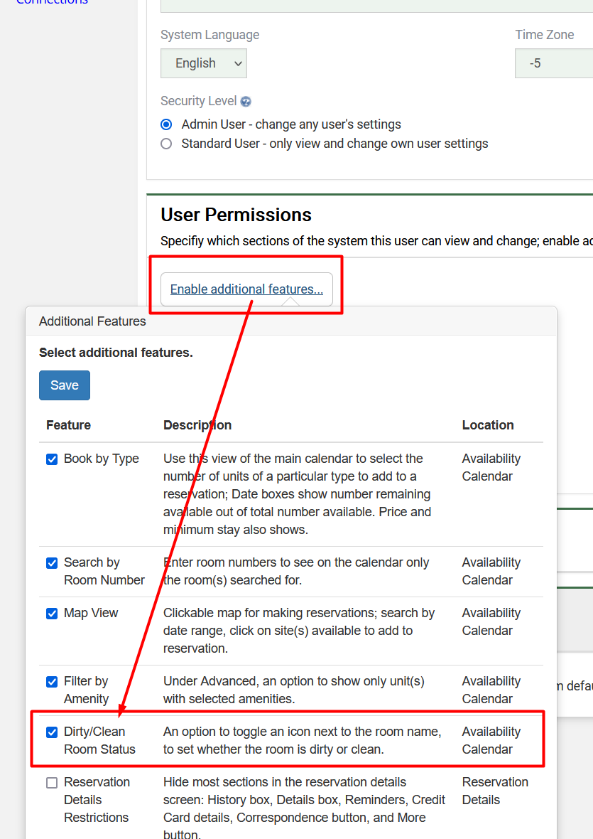 It is now possible to click to change the cleaning status of a room. This option can also be set automatically based on the reservation status. 1. Enable this feature. Go to the Settings tab, Users, User Permissions for the user(s) that you want to enable this feature for. Then click Enable Additional Features and …