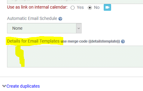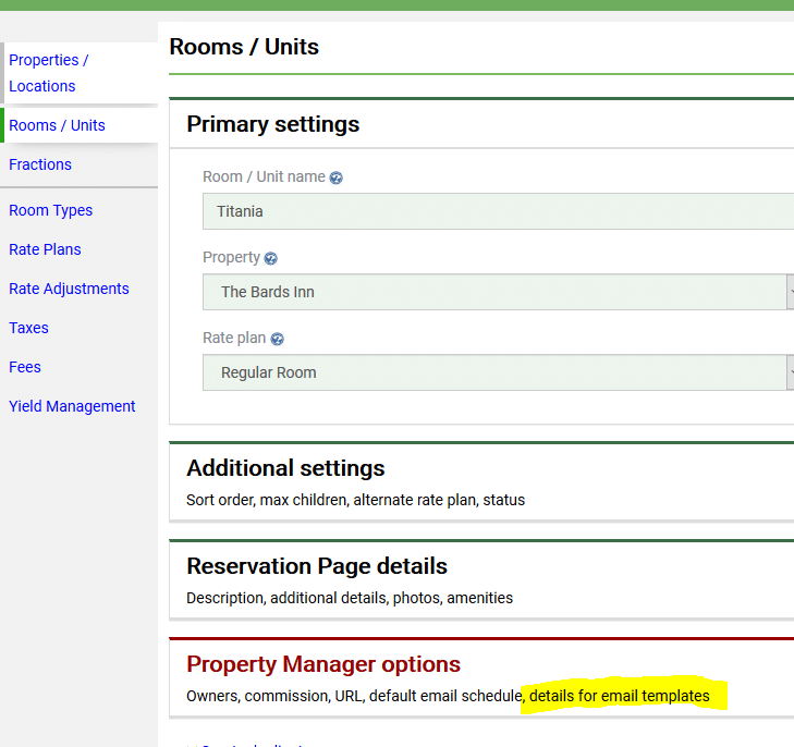 To set this up, just add your details that will be included in your email in the Room/Unit settings (Properties tab). Under the Property Manager options you will find a text box “Details for Email Templates.” Add all your unit specific information there and then use the merge code {{detailstemplate}} in your email templates to have the system automatically pull this information.