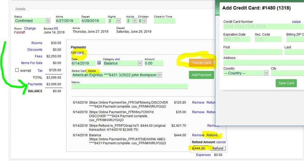 Once set up, under Reservation Details, Payments, all of these options will be available:
