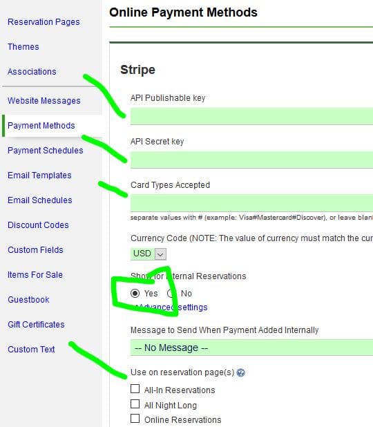 To add to our selection of payment methods, we now offer Stripe as an option. To set this up go to Website tab, Payment Methods, ADD, select Stripe. Then fill in these fields: Once set up, under Reservation Details, Payments, all of these options will be available: