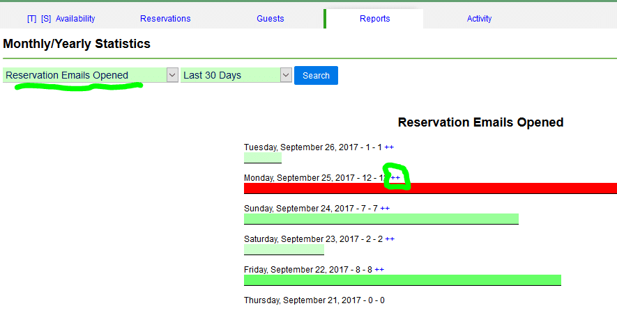 An easy way to see a list of all emails opened on a particular day is to use the Monthly/Yearly Statistics report and select “Reservation Emails Opened.” Then click the link next to each date to expand that day’s results.