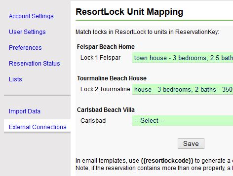 **ResortLock connectivity –**One of the newest connections in the External Connections section is a link with ResortLock. This link allows merge codes to be used in ReservationKey templates which will generate an access code to a lock in your ResortLock account. Currently we are still debating the best way to fully implement this in ReservationKey. At this time we have added a merge code {{resortlockcode}} which can be used in e-mail templates to pull the access code from ResortLock. If you use ResortLock and are interested in using this feature please contact us as we would like additional input on how best to further develop this.