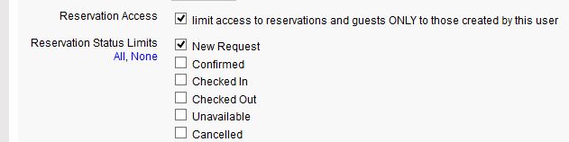 Additional user permission settings -If users are limited to see only certain rooms/units, when they go to the Rooms/Units tab under the Properties tab they will only see the rooms and they have allowed access to. Additionally, there is a new setting to restrict users to only see reservations and guests that they have added themselves. Any reservations added by other users will not be accessible and will show on the reservation calendar just as if the dates were blocked. Also, users can be limited to which reservation statuses they are allowed to use. This is useful if you want other users in your account to be able to add reservations but not necessarily block the dates on the calendar. You could limit that user to only have access to a reservation status that does not block the calendar.