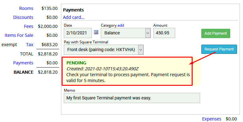It is now possible to connect a Square Terminal with your ReservationKey account. With swiping, dipping, or contactless payment, you can take advantage of lower processing fees. The process of making a payment is almost exactly the same as processing a credit card directly within ReservationKey. Once a Terminal is set up, in our payment section you will find a new button “Request Payment” which sends the payment to your Terminal. Once payment is made, ReservationKey is automatically updated to show the payment.