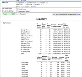 Take a look at Occupancy #2 for a breakdown by room/unit of occupancy for a given month. This report has these headings: # Nights Booked # Nights out of Service # Nights Total Average Occupancy Average Rate Total Charge Per Room