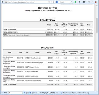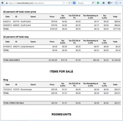 And, we also now have two new tax reports. Both these reports give a breakdown, by day, of all charges associated with a reservation. Taxes – Revenue by Item splits the report into groupings by item under the main categories (Discounts, Items for Sale, Fees, Room/Unit Charges). The other report, Taxes – Revenue by Type, groups all under these main categories. Both reports list columns for every tax type that you have added to the system, and shows an entry in any column in which tax was charged for a particular item. Make sure to review the notes at the very bottom of the report for things to keep in mind when using this report.