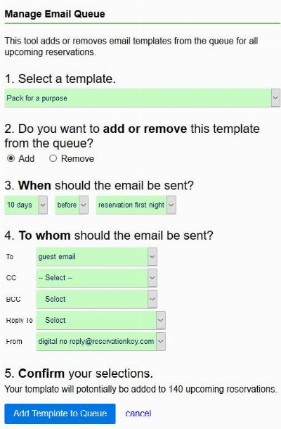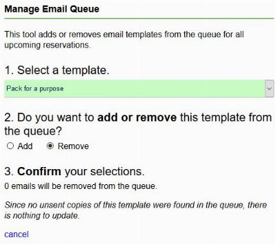 Now it is easy to add new email templates to the queue for existing reservations. This is useful if you have created a new email template and you want it to be added to all upcoming reservations. Previously it was necessary to go through each reservation one at a time and add the new message.