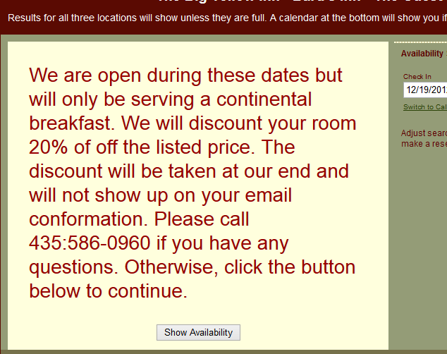 Maybe this is the time of year that you want to turn off your online booking page and take a break for a few days. Some innkeepers want to be able to take reservations, but only via phone calls so that they can properly instruct potential guests. Or maybe you have a special message you want to show the guest, and as long as they have read the message, they can continue and make an online booking.