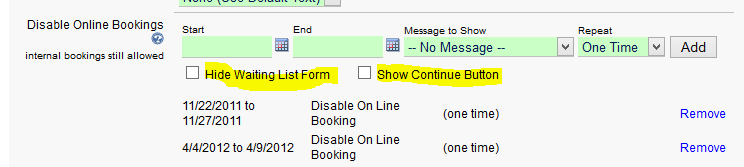 The new features here, are the checkboxes (highlighted in the screenshot below) that allow you to include a Continue button below your message. And also, now a checkbox to hide the Waiting List form in case you don’t want to use that form for these disabled periods.