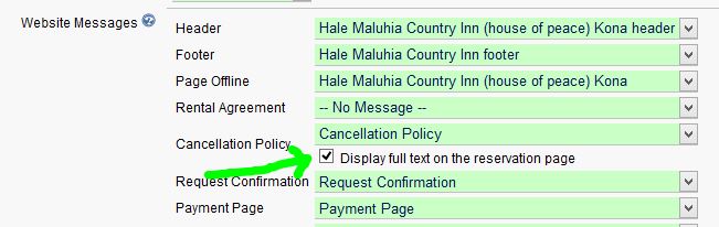 In response to requests from users, we have added an option to set whether your cancellation policy should display the full text on the reservation page, instead of being displayed in a popup box. It seems that the credit card companies have become more strict about where the cancellation policy needs to be displayed. Unless it is showing right on the page, immediately above the Make Reservation button, there is a greater chance of the credit card company siding with the buyer in the case of a challenge regarding a charge due to a cancellation.