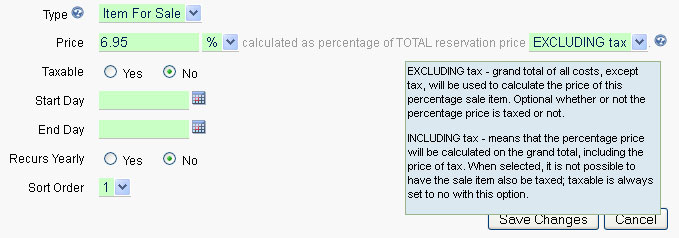 Now you can set whether or not an item for sale that is a percentage should calculate the percentage price based on the total reservation price, including or excluding tax. This is useful if you are selling something such as Trip Insurance, that needs to be based on the total price of the entire reservation, including tax.