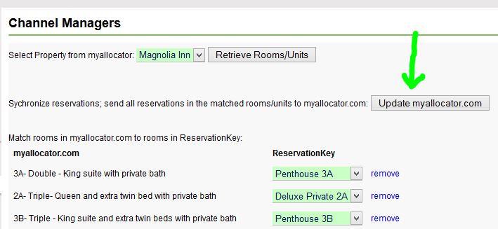 Then, return to ReservationKey and go to the Settings Tab, Channel Managers. There you can add myallocator.com and link your properties. To transfer your reservations initially, use the update button. That will send all your upcoming reservations to myallocator. Once you have linked your units to myallocator.com, further changes in reservations will happen automatically, and usually within seconds after changing a reservation in ReservationKey your change will show on myallocator.