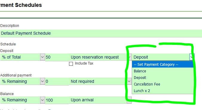 One of our users noticed that payments coming from a reservation page are not categorized like payments that are entered internally. So we have now added an option to set what category should be used for the initial payment from the online payment page. This setting is found under the Website tab, Payment Schedules. Whatever is set here will now be used as the payment category for the initial payment. Remember, you can set up your own Payment Categories under Settings, Lists.