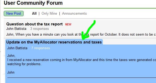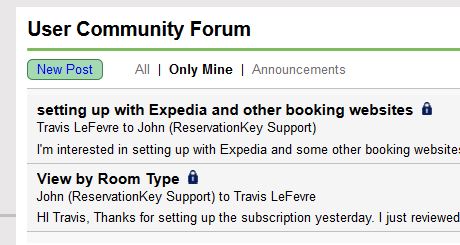 - click All to see all public forum posts, any private conversations you were a part of, plus any ReservationKey Announcements