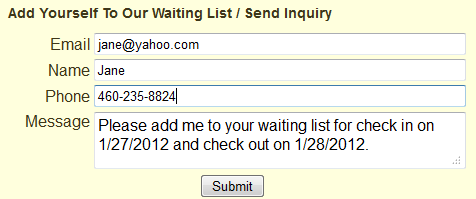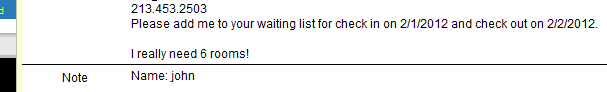 The message submitted through this new form is sent to your ReservationKey account email and added to the notes bar for the arrival date the prospective guest searched. Adding the information to the notes bar is especially useful since it ties the request to a specific date. If you have a cancellation and a room opens up, instead of trying to remember what dates you had an inquiry for, you can see that you have a note for that date already set up with the wait list guest’s information.