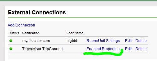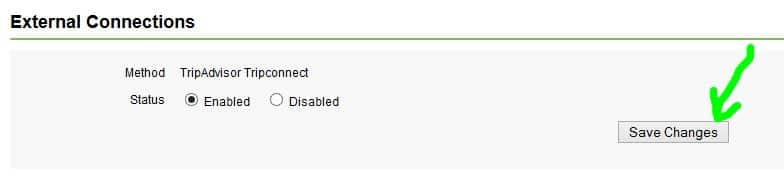 1. Go to Settings Tab, External Connections and click Add Connection. Select TripAdvisor TripConnect. Click Save Changes.