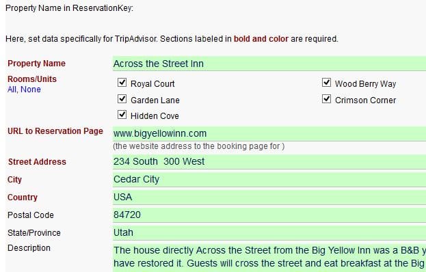 3. You can now edit the data which will will be sent to TripAdvisor. Also, you can set which rooms/fractions that are part of the selected property that you want to make available to TripAdvisor. We have pre-filled many of the fields based on data found elsewhere in ReservationKey. But feel free to change these as needed. This will only change the data to be sent to TripAdvisor, not for all of ReservationKey. Then click Save Changes at the bottom of the page.