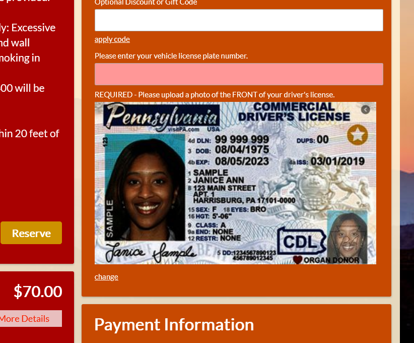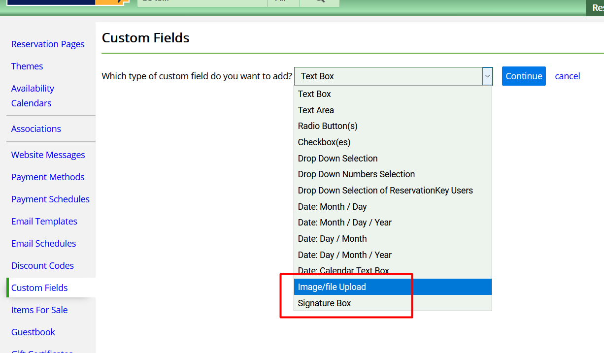This type of field makes it possible to ask your guests to upload photos, such as a photos of their ID or driver’s license. Other possibilities could be for a guest to upload a signed copy of a form. You also could use this as an internal only field, such as for uploading a photo of your guests into their reservation details.