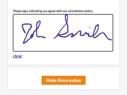 With this field, you can ask guests to sign, such as an indication of acceptance of your terms and conditions or cancellation policy. The guest uses their finger or mouse to sign, and the signature is saved into the reservation details.