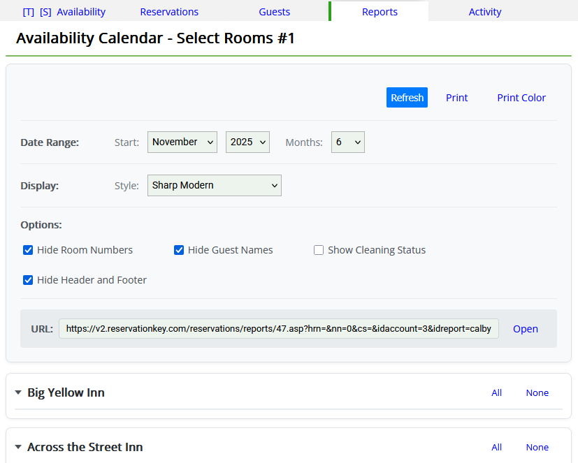 Each report provides direct Print and Print-Color options, opening the calendar in a new tab for simple printing or linking. This makes it easy to generate housekeeper-friendly daily schedules or provide quick access to key availability views without requiring full login credentials.