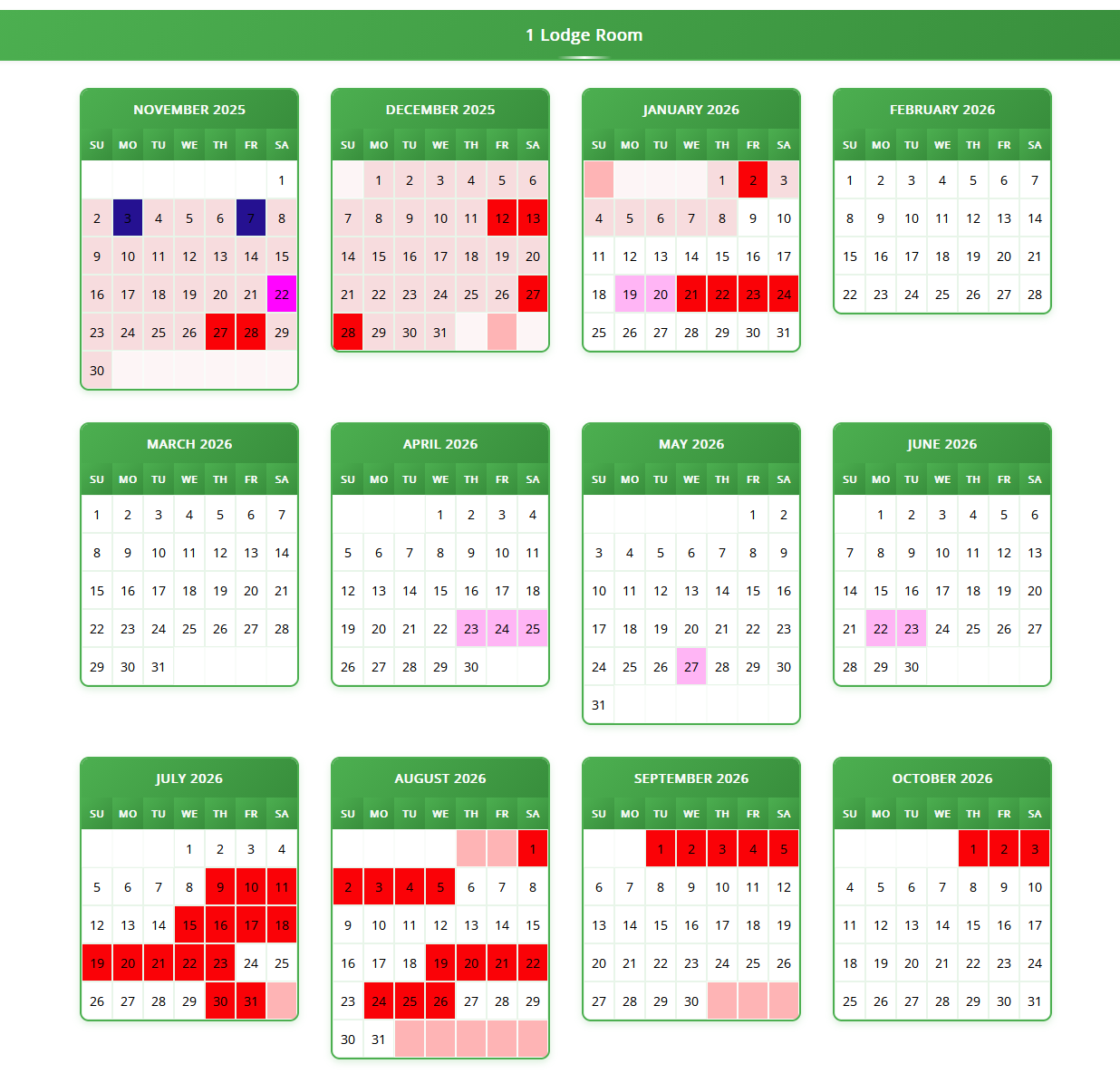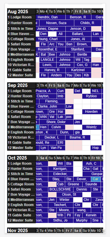 A month-by-month layout with individual calendar blocks. This is especially useful for vacation rentals or single-unit properties where you want to show a simple, standalone calendar for one unit across multiple months.