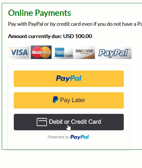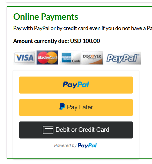 We have updated our PayPal payment so that we now have an option to use PayPal's SmartButtons. This gives your guests more options for payment such as Pay Later, pay with a debit/credit card, and pay via Venmo.